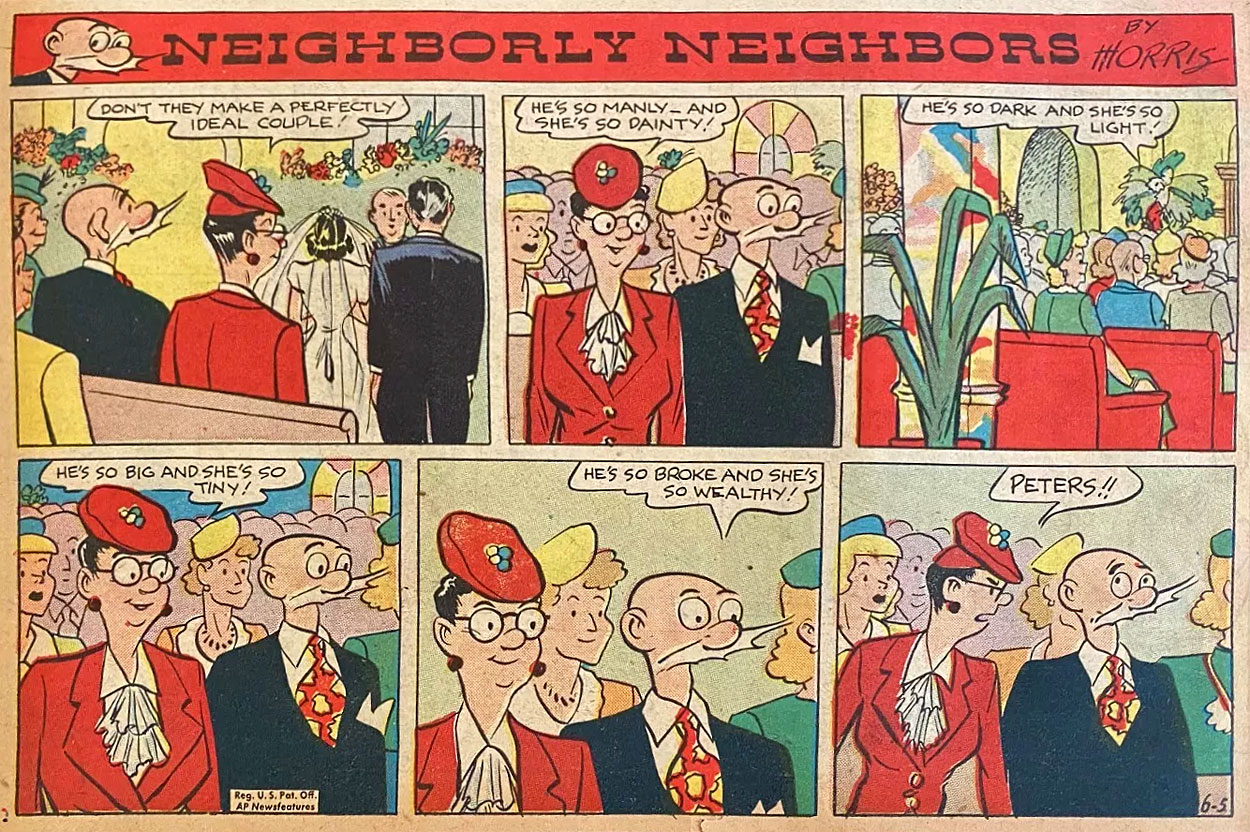 Morris' earliest comic strip was a Christmas-themed one-shot story, 'Christmas with Dot and Dick', syndicated by the Associated Press throughout December 1935. In August 1938, Morris succeeded Oscar Hitt as the artist of the AP's daily gag cartoon/comic 'Neighborly Neighbors'. Running since 1930 under various titles before its final one, the feature visualized everyday village life. Every daily episode was a one-panel cartoon in which a bald, white-mustached man named Peters played the starring role. In October 1941, Morris also launched a Sunday comic version, following a more traditional two-strip gag format. He continued both the daily and Sunday versions until 30 January 1955, after which the feature was discontinued.
