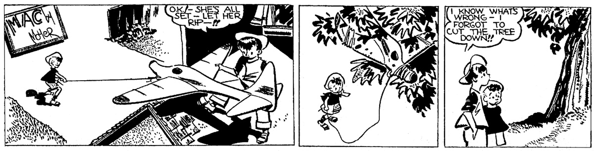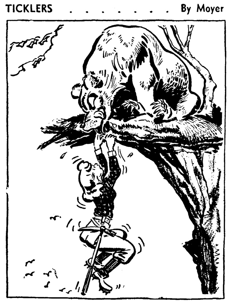 Still a teenager, Moyer was assigned to the NEA's budget comic features, which were offered to smaller newspapers. He succeeded John Sunley on the rather corny humor panel 'Ticklers' between 1 September 1941 and 16 March 1942. After him came Bill Arnold, Hayes and George Scarbo. Moyer was also the final artist to draw 'Mac', a weekly gag strip about a young street kid, drawn by Irving Knickerbocker, Andrew A. Munch and Howard Boughner before him. Boughner had retitled the strip to 'The McCoys', but by the time Moyer began, the feature returned to its original title, 'Mac'. Moyer worked on the strip from 29 September 1941 to 3 May 1943. Between 12 and 19 January 1942, Moyer also drew the final installments of 'The Great American Home', a cartoon panel created in 1913 by Walter R. Allman.