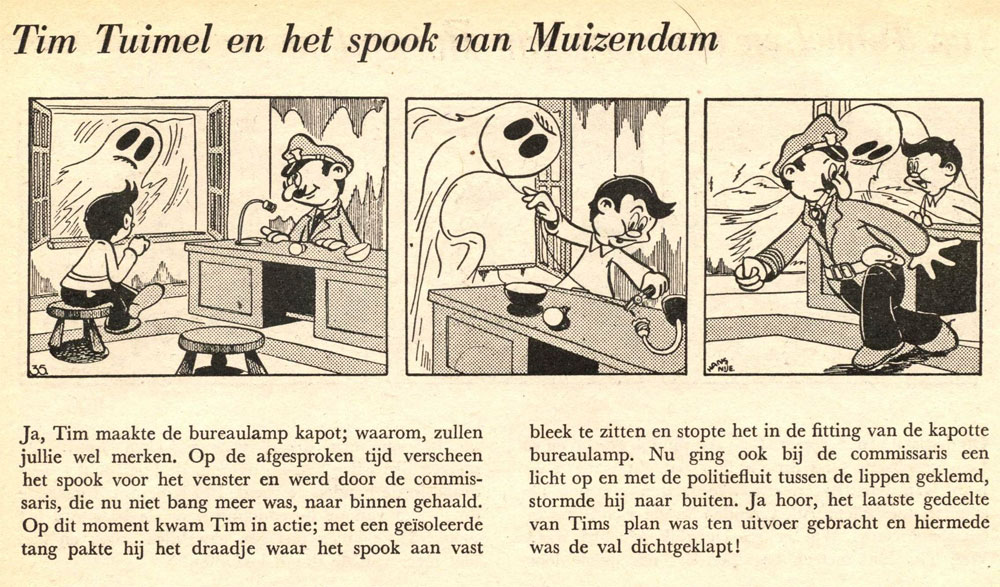 Nije, who lived in Hoorn, provided three stories with a character called 'Tim Tuimel' (1946-1947), who coincidentally slightly shared his looks with Piet van Elk's hero 'Bim'. Nije signed the strips with "Donald", as a tribute to his son. The young Donald Nije, nicknamed "Donny", also served as an inspiration for Albert van Beek's strip 'De Avonturen van Ronny en Donny' (1947-1948). Like many other heroes, Nije's Tim Tuimel was just minding his own business, when he got involved in a major plot. In his first adventure, 'Tim Tuimel Knapt Het Op!', he finds himself in the middle of a large petrol scam. By the time of his second story, 'Het Spook van Muizendam', Tim has found his calling as a detective, and is asked to look into the case of a haunted house. His third and final adventure, 'Tim Tuimel op Diepzeetocht' brings Tim to the bottom of the ocean. The first two stories were collected in book format by Mebovig in Haarlem around 1950. The third adventure was published by Stripfilm collector and connoisseur Ernst Slinger on his own in 1998.