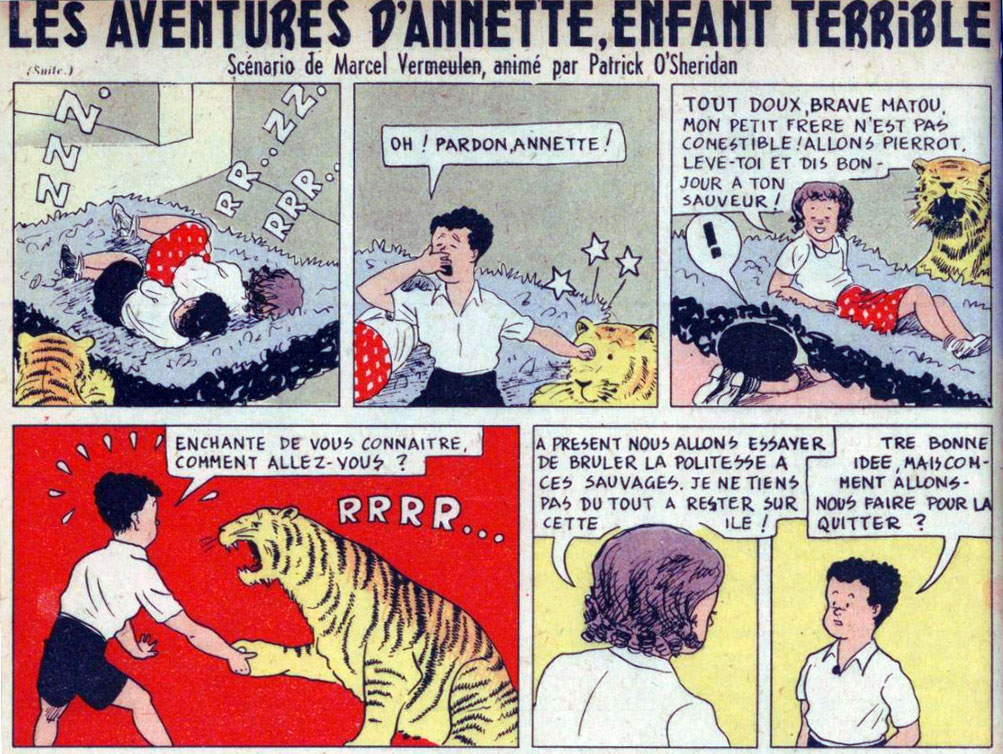 Throughout its run, O'Sheridan worked with scrptwriter Marcel Vermeulen on the magazine's title comic serial, 'Les Aventures d'Annette, Enfant Terrible'. As was common that time period, the adventures lacked a structured plot, but instead brought its main heroes, Annette and her friend Pierrot, from one situation into another.