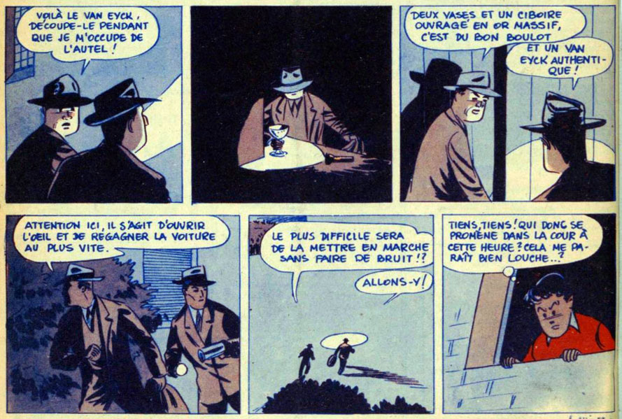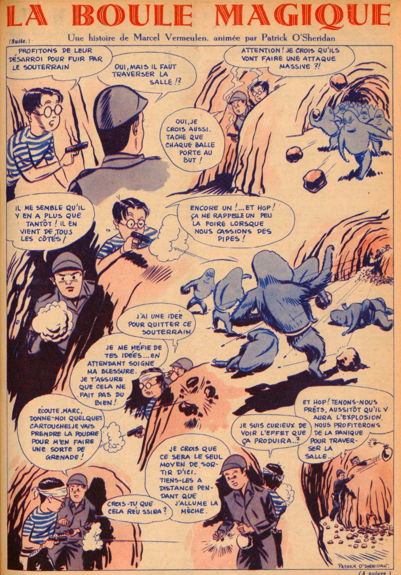 In addition to the weekly title serial, O'Sheridan also contributed additional serials and a couple of gag comic strips to Annette magazine. Between 26 September 1946 and 17 April 1947, O'Sheridan and writer Marcel Vermeulen created the serial 'Le Mystère de la Rue sans Pavés', about a girl called Peggy who helps clear an old vagabond accused of robbing the local jeweler. Then, between 24 July 1947 and 24 March 1948, the O'Sheridan-Vermeulen team created 'La Boule Magique', a comic serial with the accidental space adventures of two boys. Told in an experimental style of visual storytelling - the comic panels have no borders and playfully flow over into each other - the story's trip to the moon was full of weird imagery.