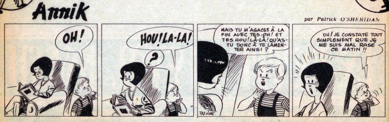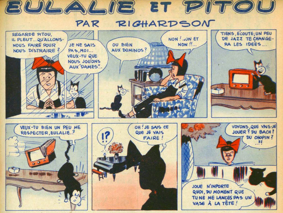 During the entire run of Annette magazine, O'Sheridan also drew the everyday shenanigans of the girl Annik and her kid brother Dicky in a series of gag strips. Another gag page in Annette by Pat O'Sheridan, but signed with "Richardson", was 'Zénobie et Pitou' (19 June 1947-7 July 1948), telling the funny and at times weird bizarre adventures of a girl and her talking cat, Pitou. Later in the strip's run, Zénobie was renamed Eulalie.