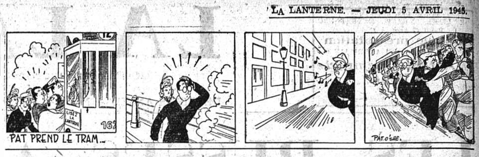 In 1945, the signature of "Pat O'She" first appeared in La Lanterne, a Brussels newspaper "of national unity and international solidarity". Earlier in its short run, the paper had run the 'Little Dearia' strip, drawn by an unknown artist signing with Sébastien. In five irregular appearances between 4 and 12 April 1945, O'Sheridan's pantomime gag strip 'Pat' presented the slapstick adventures of a common bourgeois man. O'Sheridan also contributed cartoons and illustrations to the paper. Launched shortly after the Liberation of Belgium (September 1944), La Lanterne was the first Belgian post-war newspaper that ran comics, although after May 1945 it turned to American comics like Otto Soglow's 'Little King' and Carl Anderson's 'Henry'.