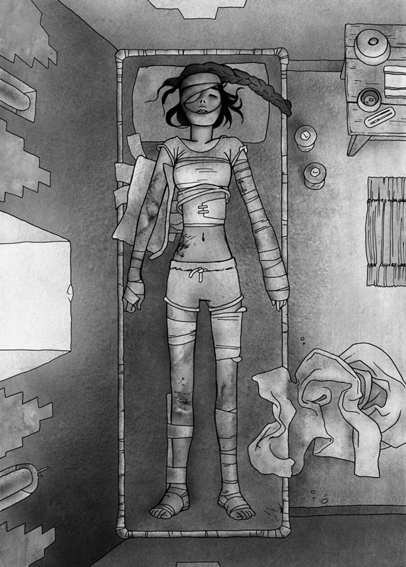 In 2005 Melody was awarded a Xeric publishing grant for the first issue of 'In the Hands of Boys'. The second issue, which is the conclusion of the book, was released April 2012. Melody is usually working on 'Trinadot', but between panels she is focused on illustrating and painting.
