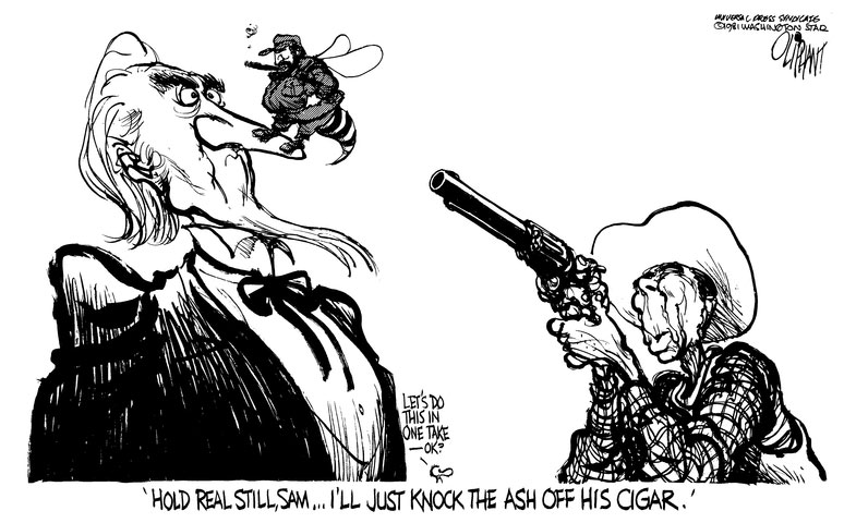 Pat Oliphant cartoon of 23 February 1981, featuring Ronald Reagan trying to shoot Cuban president Fidel Castro on Uncle Sam's nose.