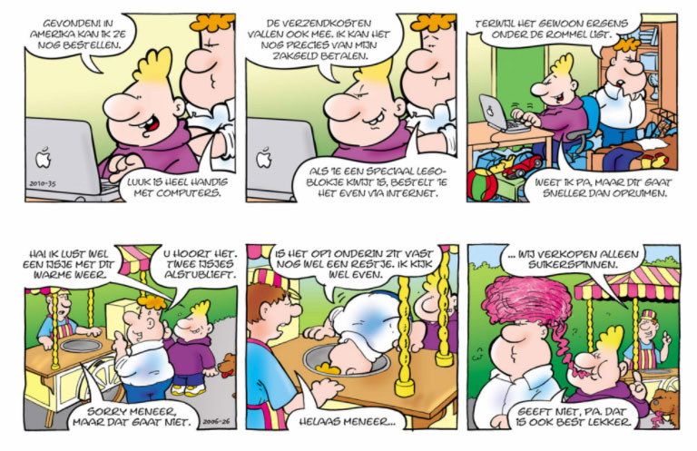 During the 2000s, he made the popular children's gag strip 'Luuk en z'n Pa' ("Luuk and his dad") for EO Visie, the weekly magazine of the Dutch evangelical broadcasting association EO. A compilation book was published by Medema in 2007, and the characters also appeared on the CD 'Luuks Liedjesfeest' (Ecovata, 2012), featuring songs written by Van Oostrum, produced by Rob & Lee-Ann Vermeulen and sung by members of the Kids Crew. He has remained associated with EO Visie as a caricaturist and illustrator. Since 2013, Van Oostrum has made illustrations and comic strips with 'Burgie', the aardvark mascot of Royal Burgers Zoo in Arnhem. Offering information about the animals in the park, 'Burgie's Avonturen' has appeared successively in Burgers' Zoo & Waarom and Kids & Zoo, the children's magazines for the zoo's season ticket holders.