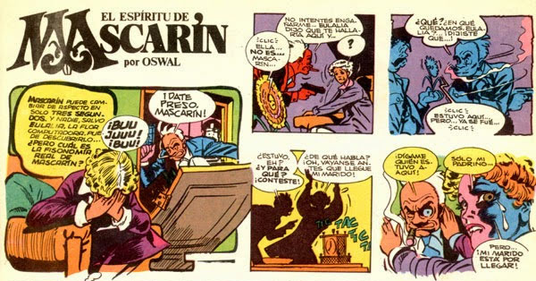 Oswal's other famous creation is 'El Espíritu de Mascarín', of which fifteen episodes were published bin Chaupinela magazine from 1975. Other creations include 'Detective en Hollywood' with Linton Howard for La Hoja (1979), 'Tito Mamut' and 'Camino a Esteco' with Carlos Albiac in Bang! (1981), 'El Bígamo' in Satiricón (1982) and 'Claudio Forroquina' with Dalmiro Sáenz in Superhumor (1982).