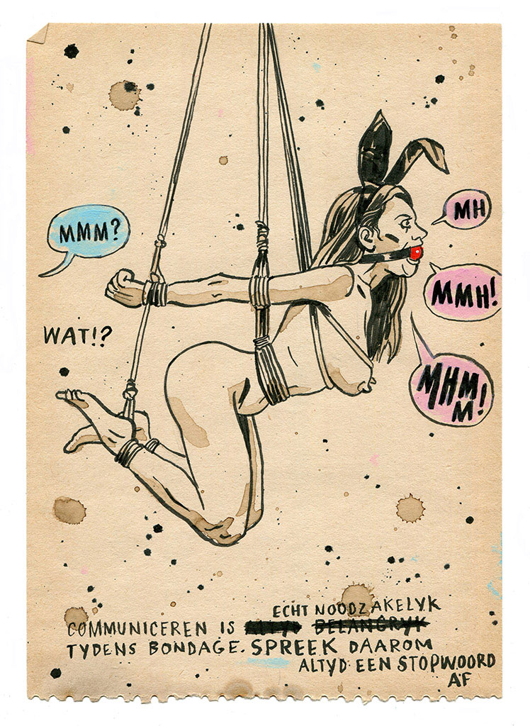 Prints by Overweel. Translation of the second drawing: "To communicate is really necessary during bondage. Always agree on a word to indicate quitting everything."