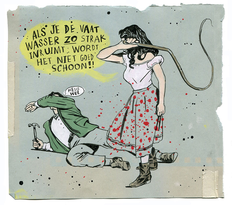In his subject matter, Overweel was constantly searching for contrast, for instance showing a well-dressed newsreader simply saying the word "anus", a marital dispute over the dishwasher being fought out with whip and hammer, or an erect phallus dressed as a Tibetan monk. Fuelled by his self-proclaimed dirty mind, recurring themes in his work were sex, naked people and Nazis. The accompanying dialogue or caption texts, crafted in precise angular lettering, often threw the reader off balance or put things into perspective in a humorous or melancholic way. Unleashed, his illustrations often outgrew their source material, and got a life of their own. At exhibitions, they could hardly be distinguished from his personal artwork, for instance during his 2020 show 'Stay Away: It's Nothing Personal' at Gallery Van Zijll Langhout or his 2025 open-air exposition against the exterior wall of the Amsterdam pop temple Paradiso.