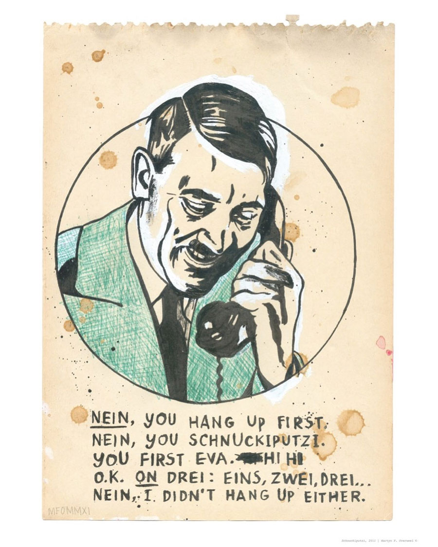 Born in Haarlem in 1971, Martyn F. Overweel attended the Royal Academy of Fine Arts in The Hague during the 1990s. Initially, he studied Graphic Design, but discovered he didn't want to work with computers. Preferring paper, markers and pencils, he moved to the Visual Arts faculty, and graduated in 2001. After a bout with cancer, of which he was cured, he sold his first editorial illustration to the newspaper De Volkskrant in 2003, and his work as a freelance artist took off. For most of his career, Overweel lived and worked in Amsterdam, where he had his atelier in a former theater in the Nieuwmarkt neighborhood. In style, spirit and graphics, his artwork was reminiscent of the American punk artist Raymond Pettibon and the Monty Python animations of Terry Gilliam.