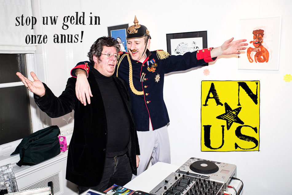 Gabriël Kousbroek and Martyn Overweel, AKA Kaiser Kütlipp II promoting their magazine Anus. Translation: "Put your money in our anus!"