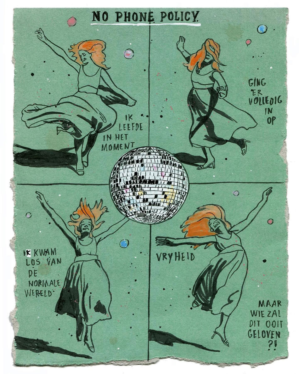 Rare sequential illustration for an article about "clubbing without smartphones", published in the newspaper Het Parool's weekly supplement PS, 31 August 2024. Translation: "I lived for the moment. Was fully immersed in it. I broke free from the normal world. Freedom! But who will ever believe it?!"