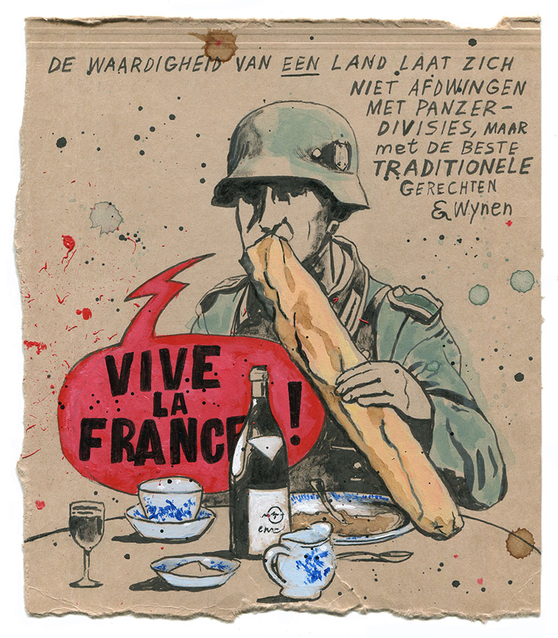 Illustration for the book supplement of De Volkskrant (28 June 2025). Translation: "Vive La France! The dignity of a country isn't forced by panzer divisions, but with the best traditional meals and wines."