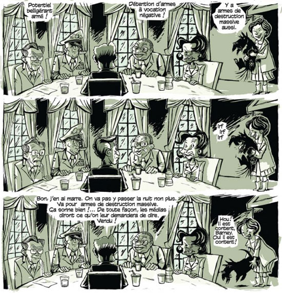 Paulo and Robberecht were also present in Spirou magazine with the animal series 'Zack et Willie', of which a book collection was published by 12bis in 2010. The duo has additionally cooperated on 'Le Monde de William' (2005), an educational book about homosexuality for Exaeqo. Paulo has been the artist of several humor books published by 12bis, including 'Dégelée Royale' (with Robberecht, 2010), 'Le Pouvoir de Convaincre' (with Gilbert Thiel and Bernard Swysen, 2012) and 'Rachida Aux Noms des Pères' (with Swysen and Yves Derai, 2013). With Sergio Salma, he created 'Bagdad KO', a book of gags about the US-Iraq conflict (Drugstore, 2009).