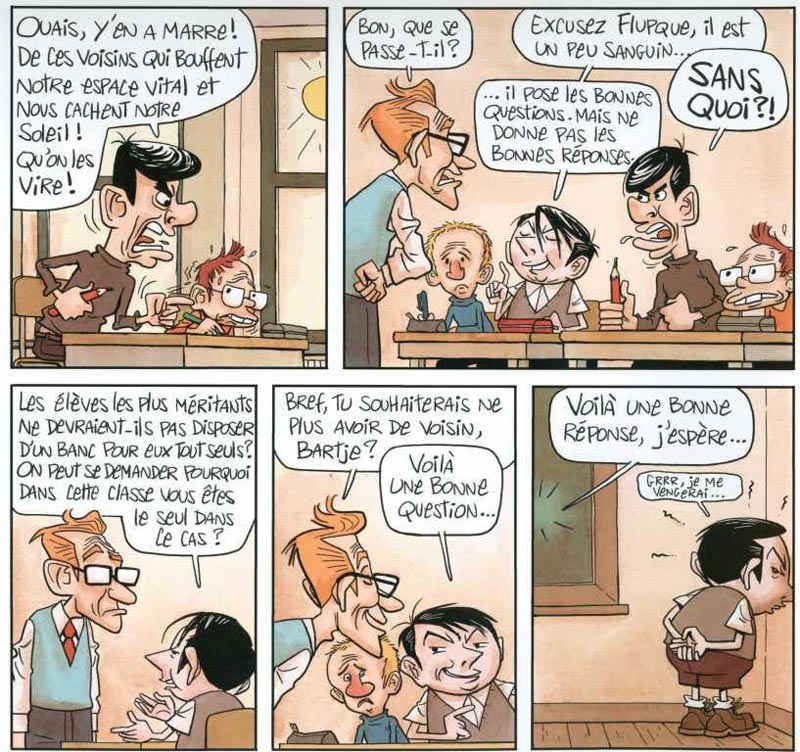 'Bad Bartje'. This scene pokes fun at Flemish politicians Bart De Wever (the obese boy) and Filip Dewinter (the tall boy), nicknamed "Flupke" as a wink to Hergé's 'Quick and Flupke'. De Wever is head of the N-VA and Dewinter is leader of the extreme-right party Vlaams Belang. Both parties are known for their separatist, conservative and Flemish nationalistic viewpoints, with the difference that het Vlaams Belang is notorious for its racist and discriminatory ideology, which led to a conviction for these matters in 2004. Here, Dewinter shouts that his neighboring classmates are taking in "too much space". When the teacher asks what is going on Dewever tells him that "Flupke poses good questions, but doesn't provide the right answers". He explains that the pupils have the right to receive space of their own, whereupon the teacher fulfills Bart's request by putting him in the corner.