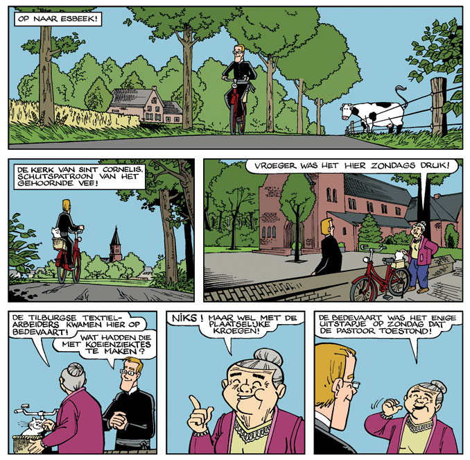 Paulussen's comics and cartoons have appeared in the newspapers Algemeen Dagblad and Dagblad de Limburger, QUATRO magazine and several staff magazines. In addition, he has been active as a live cartoonist. Among his other clients have been the municipality of Sittard, as well as several hospitals and local entrepreneurs from the Limburg region. In 2009, he teamed up with his former editor Paul Spapens again for a comic book aimed at promoting local entrepreneurs in the town of Hilvarenbeek. An avid cyclist, Spapens opted for a pastor who travels through town by bike to get to know his new parish. Working in collaboration with co-scriptwriter Jan Smeets, Paulussen created the resulting comic book 'Pastoor Hilvermans en de Drie Schijnheiligen', which was published under the Pix4profs imprint.