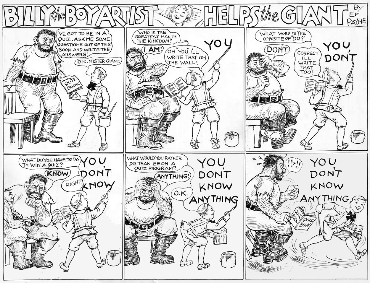 Ed Payne was an early to mid-20th century American cartoonist, who had a long association with the Boston Globe. Working for the paper since the late 1890s, Payne created several comics features for the color Sunday supplement. Most notably 'Billy the Boy Artist' (1899-1955), which he wrote and drew for a staggering 56 years, allegedly without any assistance. This makes him one of the all-time record holders for longest-running comic series by one individual. His second best-known comic strip was 'Professor O. Howe Wise and Professor I.B. Schmart' (1902-1911). At the time, both comics were adapted into theatrical plays.