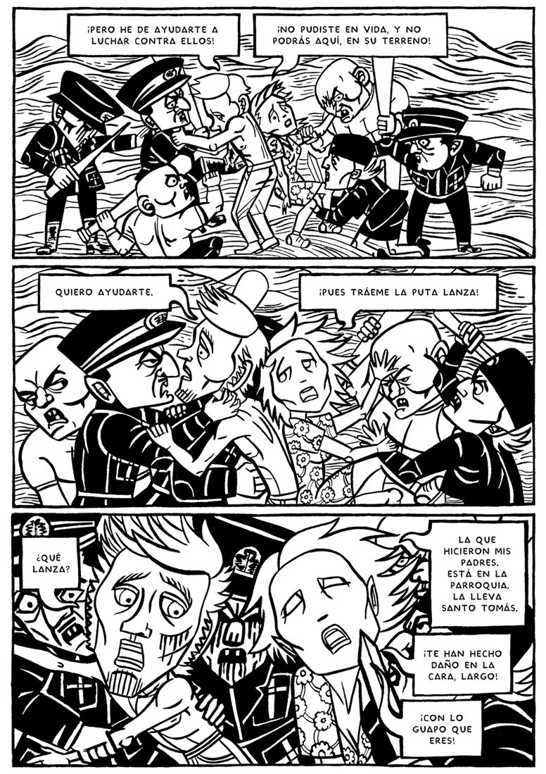 With Hernández Cava, Pérez Vernetti also contributed to collective books dealing with more socially engaged and humanitarian subject matter. The French anthology 'Nous Sommes les Maures' (Amok, 1998) dealt with the relationship between Europe and the Mahgreb region throughout the ages. '11 M, Once Miradas' (De Ponent, 2005) contained stories dedicated to the victims of terrorism. 'De Ellas' (2006) reinvented and celebrated the role of women in comic books. 'Nuestra Guerra Civil' (Ariadna Editorial, 2006) commemorated the 60th anniversary of the Spanish Civil War, and 'Guadalajara sera la Tumba del Fascismo' (De Ponent, 2007) featured art inspired by war propaganda posters to illustrate the text of Leonardo Sciascia's 1960 book 'El Antimonio'.
