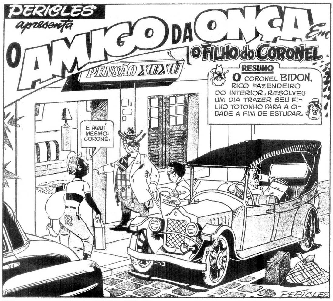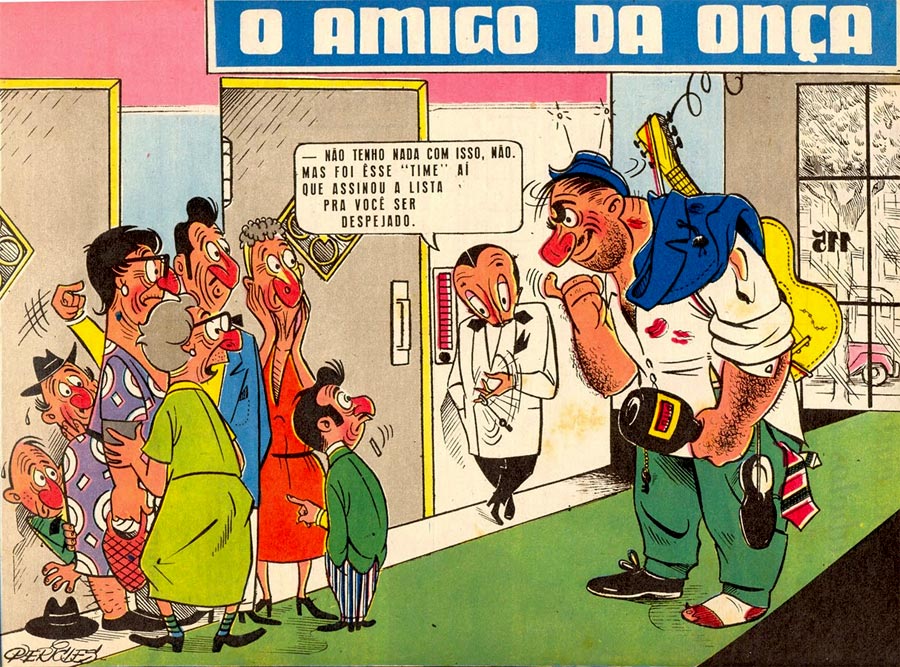 His name "O Amigo da Onça" (literally: "The Jaguar's Friend') was based on a popular joke of the time, in which one person keeps asking another person what he would do if a jaguar would attack him. The other has several answers, but the interviewer keeps coming up with alternative situations. Eventually, the second person answers, annoyed: "Hey, are you my friend or the jaguar's friend?" 'O Amigo da Onça' quickly became one of Brazil's most popular cartoon characters. The phrase "O Amigo da Onça" even became a popular saying, referring to someone who always gets a friend in trouble. Péricles continued the feature for nearly 20 years, while for ten years also providing the art for Millôr Fernandes' section Pif-Paf.