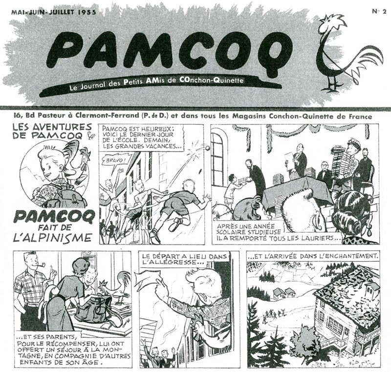 Between 1955 and 1957 Pétillot was involved in Pamcoq, an obscure advertising magazine of a clothing brand (Conchon-Quinette) of Clermont-Ferrand (Puy de Dôme - France). For issues 2 till 10, Pétillot illustrated 'Les Aventures de Pamcoq'. Later installments were drawn by Jean-René Le Moing.