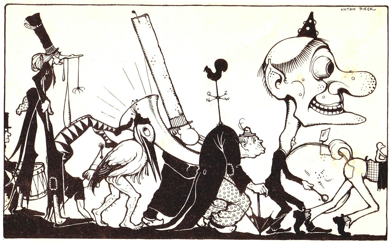 In the 1920s, Pieck saw his first drawings published. He struck up a friendship with the Flemish writer Felix Timmermans (father of cartoonist GoT), famous for his signature novel 'Pallieter' (1916). Pieck illustrated the 10th reprint of 'Pallieter', released in 1921. To evoke the atmosphere of a Flemish landscape, he travelled to Flanders. Pieck remained an enthusiastic traveller his entire life, visiting England, France, Ireland, Germany, Sweden, Switzerland, Austria, Italy, Poland and Morocco to make sketches. He always regarded Belgium and England as his second mother countries, since their landscapes and architecture weren't as modernized as The Netherlands. Through Timmermans, Pieck was also encouraged to make his artwork more spontaneous, following his own spirit. From 1924 on, he started working in color.