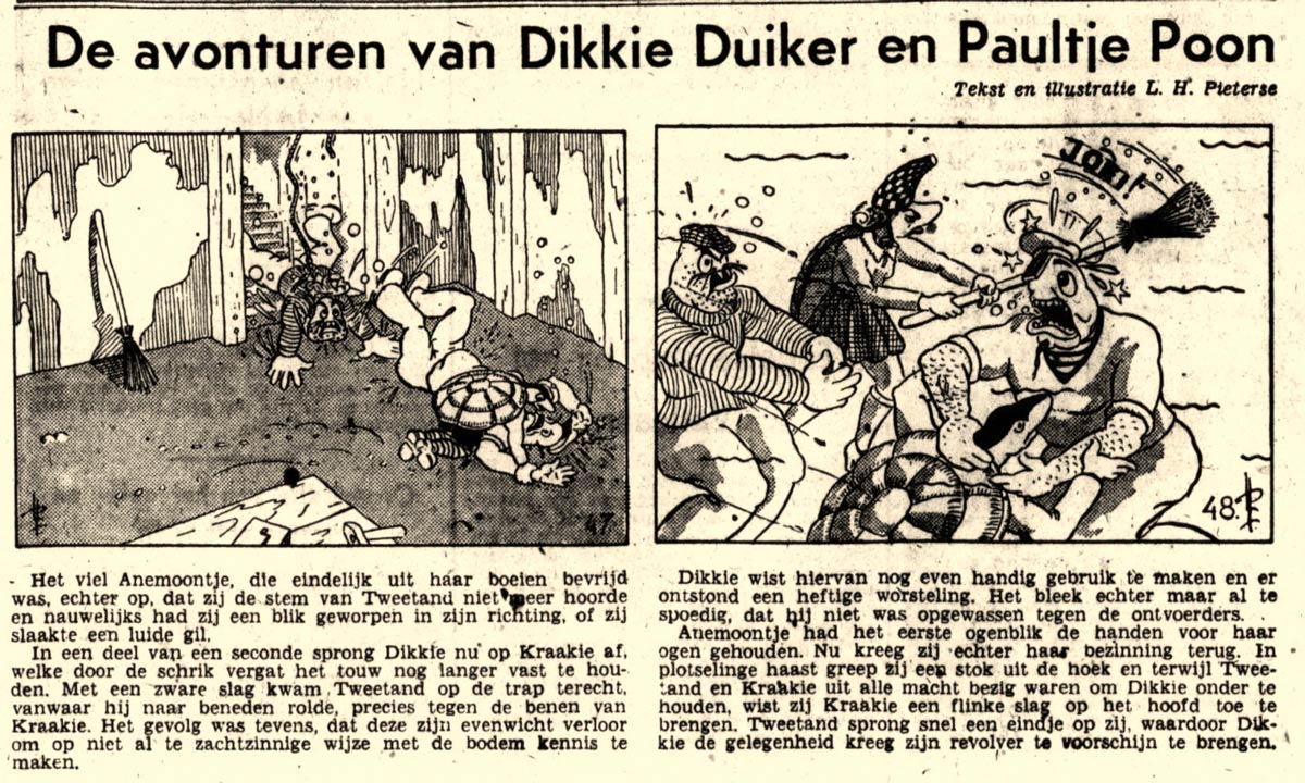 L.H. Pieterse was the writer and illustrator of 'De Avonturen van Dikkie Duiker en Paultje Poon', a daily text comic strip about the adventures of an anthropomorphic tortoise and gurnard in an underwater world. It ran during World War II, from 24 March until 13 July 1942, in Het Volk, the newspaper of the worker's movement, which at the time was under Nazi supervision.
