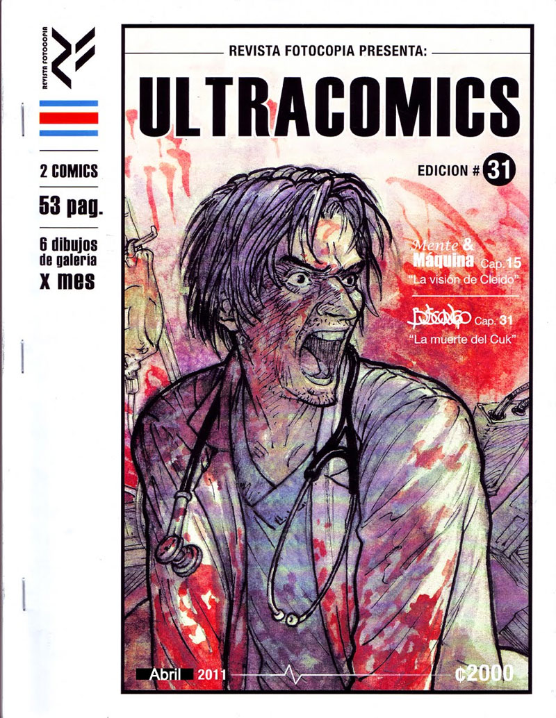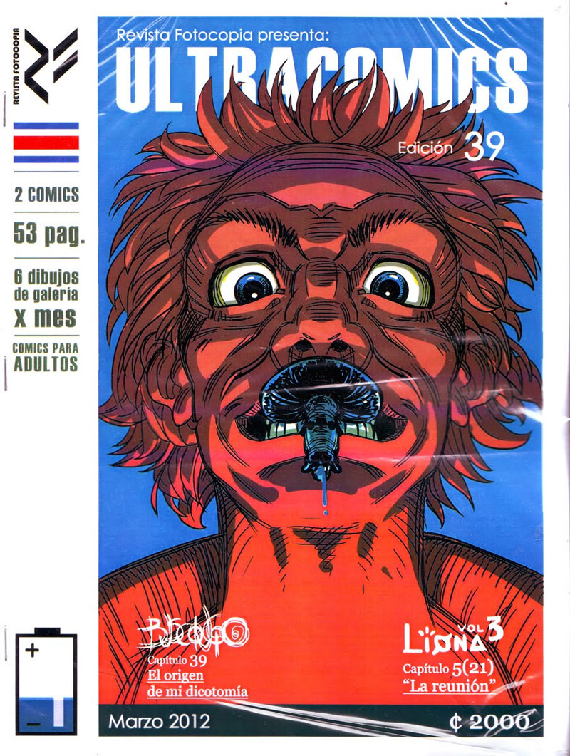 With no official comic book industry, the few local comic creators in this Central American country are forced to either work for foreign publishers (like John Timms, Daniel Mora and Franco Céspedes) or venture into self-publishing. The Ramírez brothers had a lifelong passion for drawing when they launched their monthly photocopied zine Revista Fotocopia in 2009. They changed its name to Ultracomics when the publication took a more professional lay-out in August 2010. In a 2012 video interview with The Tico Times, the brothers explained that they are the only comic creators in their home country with a constant publication rhythm, consisting of 16 pages per month. Still the success was limited. Ultracomics was for sale in about ten stores throughout the capital San Jose, with a print run of 30 copies. Even though the authors eventually made some money out of it, Ultracomics was canceled after 50 issues, making it the longest-running Costa Rican comic magazine.
