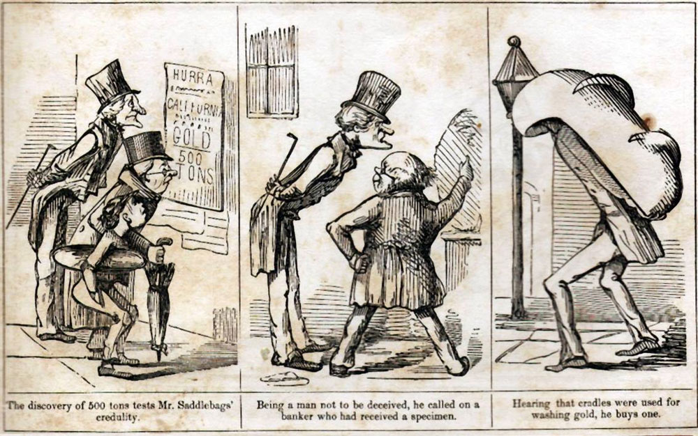 In 1848-1849, gold was discovered in California, which motivated many to travel and settle there, hoping to find fortune themselves. Most were badly prepared to survive in such a harsh environment and/or lacked the proper tools. Even so, there was barely gold to be found in the region, or at least not enough to return home as a millionaire. To outside observers, these naïve, gold-lusting men were a comical sight, which explains why they inspired many humorous stories, including James A. and Donald F. Read's picture story about the fictional miner Jeremiah Saddlebags.