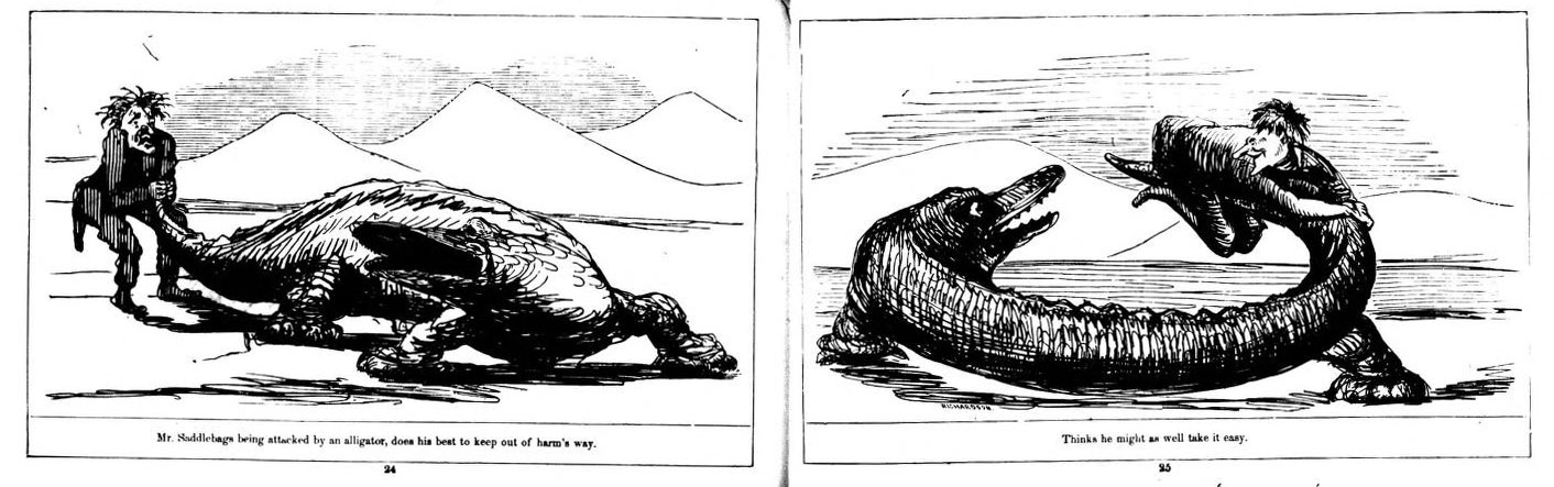 In the 1830s and 1840s, Rodolphe Töpffer's picture stories were very popular in Europe and inspired many similar prototypical "comic books". They were equally successful in translation and available in the U.S. Most historians agree that the Read Brothers must've been aware of Töpffer's 'Obadiah Oldbuck', because their comic book is very similar in style. 'Jeremiah Saddlebags' is a humorous sequential narrative about a tall, thin, very stupid and laughably unlucky man. All action is told in text comic format, with the text written underneath the images. Like most 19th-century picture stories, the narrative isn't very structured. Many random events occur and some feel a bit repetitious. On two occasions, Saddlebags saves his skin by joining people who try to capture him. Also two times he leaves a possession behind and has his enemies fight over it. And three times he stumbles upon a Native American tribe.
