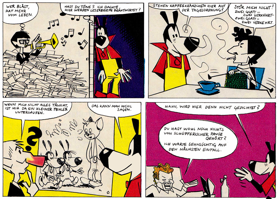 Lupo visiting the Fix und Foxi editorial offices, drawn for Fix und Foxi #361 (1962) by Florian Julino. Appearing in this sequence are Josef Dachsel (with trumpet), Elisabeth Helmrich, Florian Julino and Max Reindl.