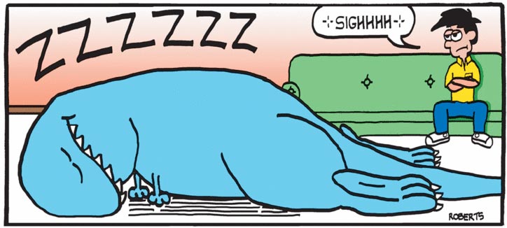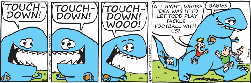 Throughout his single panel cartoons, a T-Rex kept reappearing. His famous seven-year-old 12-foot-tall 'Todd the Dinosaur', who attends second grade, was born. The Oklahoman started publishing the strip in 2001. By 2004, King Features started syndicating 'Todd', and Roberts was aided by Bob Condron for the artwork. Condron left after a couple of years, and Roberts continued the series on his own.