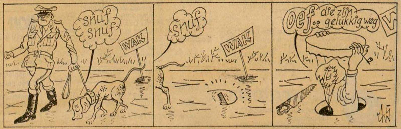 After the Liberation of The Netherlands in 1945, Rodenhuis returned to the Leeuwarder Courant, while the paper also financed his further graphic education at the Arts and Crafts School in Leeuwarden. Rodenhuis eventually worked his way up to the paper's graphic department, where he made the layouts for the news pages, designed book covers and was a graphic artist for advertisements. In 1952, the Leeuwarder Courant also ran his first comic strip, 'Gekko de Gans'. On the side, he was active as a live cartoonist in small theaters, under the name Roxi.