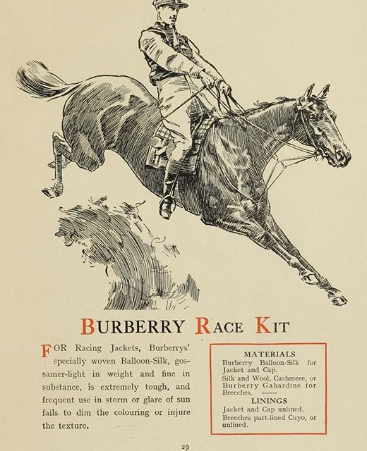 George Roller also had a longtime association with Thomas Burberry, with whom he shared his interest in horses. He became the leading advertising illustrator for Burberry's clothing firm, which is nowadays one of the country's most luxury brands. For nearly 40 years, he was responsible for establishing the company's image in a time before photography got a more prominent role in advertising. His promotional drawings of Burberry's sports attire and equipment were printed in many national magazines.