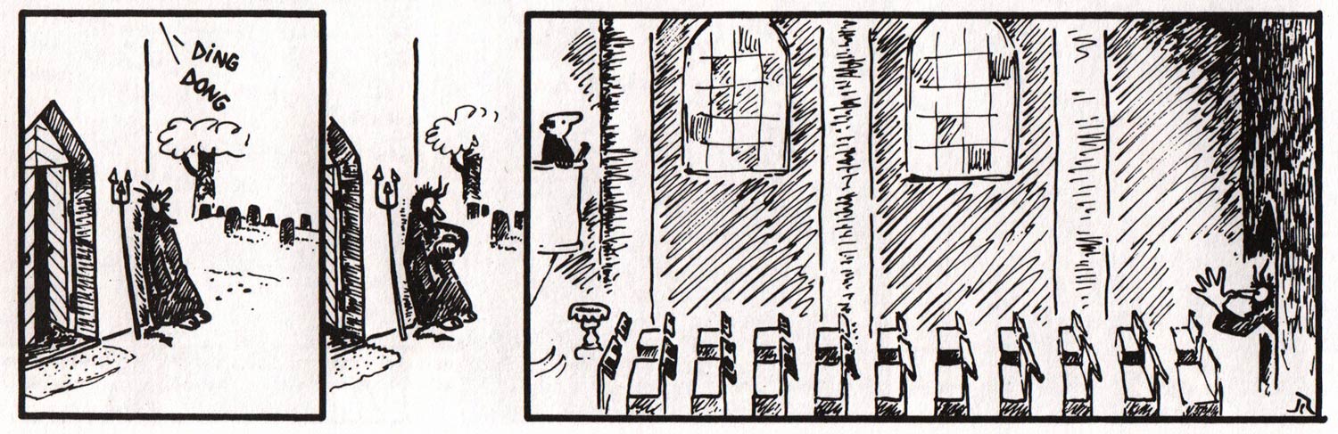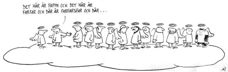 Another popular series was 'Himlens änglar' ("Heaven's Angels"), a comical portrayal of life after death in Dagens Nyheter. It stars a series of angels in night shirt, complete with wings and halo, who indulge in rather earthy activities like playing cards. God and Satan are also present. The latter regularly suffers from performance anxiety because he is not sufficiently evil. The strip has been collected in three books between 1993 and 2000.