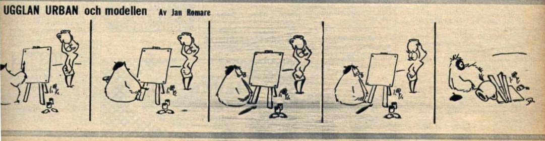 Jan Romare was born in 1936 in Stockholm and made his comics debut as a teenager. His first work appeared in the 1953 Christmas supplement Smällkaramellen of Folket i Bild, the cultural news magazine owned by the Swedish Social Democratic Party. It marked the first appearance of the hedgehog Hubert in the strip 'Ur Igelkotten Huberts Dagbok' ("From Hedgehog Hubert's Diary"). Hubert continued his career in the pages of the teen magazine Fickjournalen from 1955. Romare furthermore created other cartoon animals, such as 'Gorilla Gusten' ("Gusten the Gorilla", in Folket i Bild), 'Mullvaden Malte' ("Malte the Mole") and 'Ugglan Urban' ("Urban the Owl"). The latter appeared in the Swedish photo magazine Se from 1960 to 1962. Romare was also the author of the youth detective novel 'Mordet på Mamses' (1958).