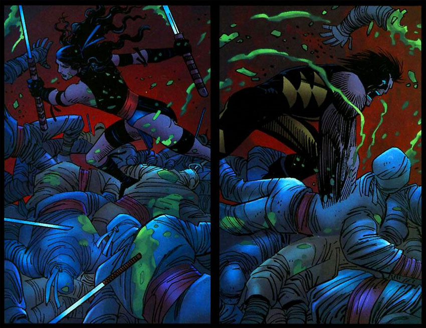 Four years after 'The Gray Area' (2004), Romita launched another creator-owned series, with Scottish writer Mark Millar and inker Tom Palmer, this time for Marvel's Icon imprint. With its first issue cover-dated February 2008, the black comedy 'Kick-Ass' (2008-2014) gave a whole new, gritty perspective on superheroes and vigilantes. The main character is the teenager Dave Lizewski, who wonders why no one in real life has ever become a superhero and decides to give it a try. With no actual training, he tackles crime in a green suit, ski mask and batons. Despite taking some hard knocks, his actions as Kick-Ass become so popular that more real life superheroes show up, most notably Big Daddy and his daughter Hit-Girl. Unlike the other amateur "superheroes", who mainly parade in their outfit and hand out blankets to the homeless, this duo really knows their stuff. The young teenager Hit-Girl in particular chops up gangsters without blinking an eye. Together with Kick-Ass, they do a lot of damage to the local gangsters.