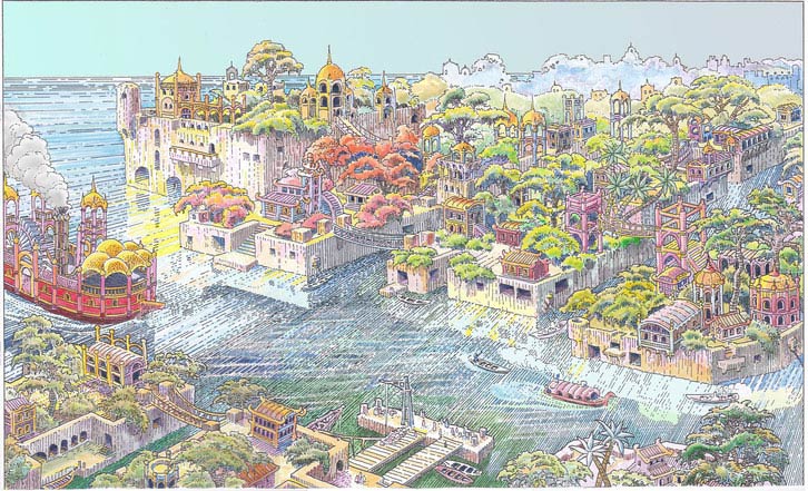 Romoli's best-known creation is 'Altri Mondi' (1977- ), a science fiction series about an anthropomorphic dog, giraffe and frog who undertake space rescue and exploration missions with their spaceship Sagittarius. The first album, 'Avventura su Efesto', was released by Nerbini in 1977. It was followed by 'Fuga su Issar', 'L'ultima Fortezza', 'Il Demone di Azul' and 'Crab Nebula'. In 1979, the imaginative and highly detailed landscapes, accompanied by cosmic maps and dictionaries, caught the interest of Nippon Animation. The Japanese studio acquired the rights to produce a 26-episode TV series adaptation under the title 'Spaceship Sagittarius'. A total of 77 thirty-minute episodes were produced, and first broadcast in Tokyo from 1986 until 1987. Remarkably enough, Romoli wasn't aware of these extra broadcasts until 1987. The series continued to be shown all over the world throughout the 1990s.