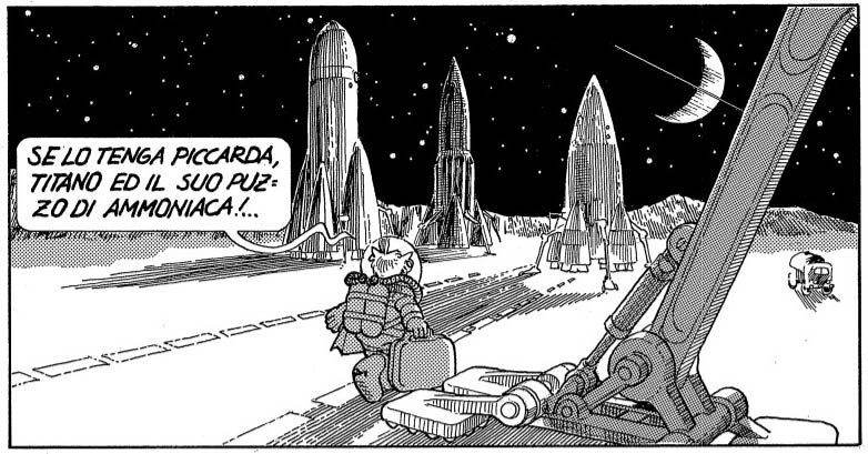 Andrea Romoli was born in 1944 in Florence. He had a happy, but modest upbringing in post-war Italy, during which his artist father got him interested in arts, sculpting, philosophy and music. He ranks Carl Barks' 'Donald Duck' stories among his major influences, as well the work of novelists like J.R.R. Tolkien, H.P. Lovecraft, Jorge Luis Borges and Herman Melville and the experiences of explorer Leonard Clark. In 1973, Romoli went to work as a physicist, developing optical systems for space applications. Space travel also became a major theme in his comics, which he created in his spare time. Misadventures with small publishers, low sales and busy working schedules often left long intervals between his publications.