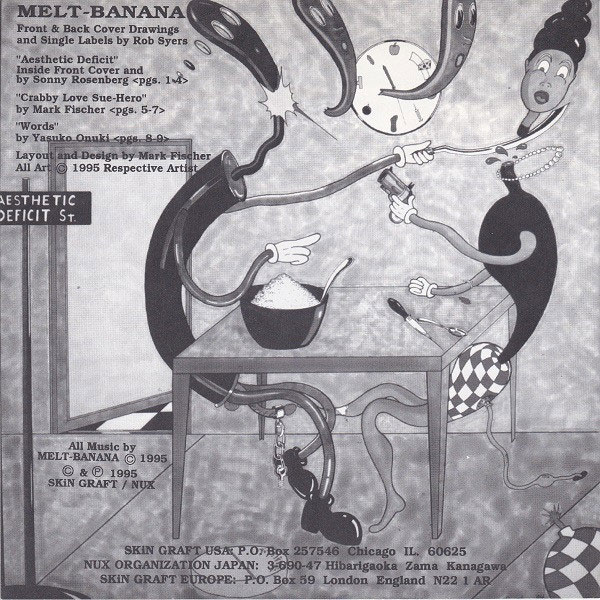 During the early 1990s, Sonny Rosenberg joined Chicago art school students Mark Fischer and Rob Syers in their punk-inspired indie SKiN GRAFT Comix releases. On their DIY imprint, he released his 1992 mini-comic 'Breadhead in ID Surgery'. He also contributed to SKiN GRAFT's next incarnation as a record label that specialized in combining their self-published comix with punk and noise-rock record releases. Rosenburg provided surrealist comic art to the inner sleeve comic inserts of the 7" single 'Patty Lane/Story Of Life' (1993) by Fruitcake (the story 'Brainbomb') and the 1995 Melt-Banana EP 'It's In The Pillcase' ('Aesthetic Deficit').