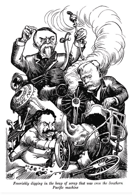 Railroad cartoon from 1914, depicting Mike de Young, Otis Spreckels, and John D. Spreckels.