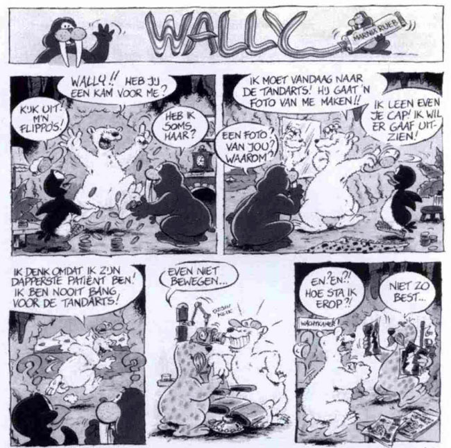 While 'Haagse Harry' is Rueb's signature work, he also made a children's gag comic, 'Wally' for the local magazine Walrus. The funny animal series revolves around a walrus and his arctic friends. In line with the magazine's educational intent, the mammal promotes dental hygiene.