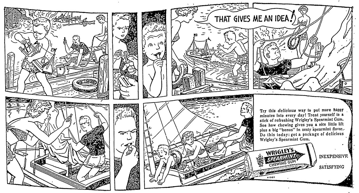 In 1954 and 1955, Rod Ruth was also the artist for a series of newspaper advertising strips for Wrigley's Spearmint Gum. The feature had no official title and the only text used in the strips was the exclamation: "That gives me an idea!". In each episode, a person (usually a child) desperately tries to solve a problem. After being given a stick of chewing gum (always depicted in a two-panel sequence), he instantly comes up with a brilliant solution. Next, the protagonist spots someone else facing a similar problem and exclaims, in a balloon spread over two panels: "That Gives Me An Idea!". He or she then gives the second person (usually an adult in a professional situation) a piece of gum (presumably not the same one he chewed on earlier), after which this person also succeeds in doing what he or she wants to do. As an additional feature, the whole two tiers are shaped in a recognizable wave form, which (along with the rigid format) was kept for the strip's whole run.