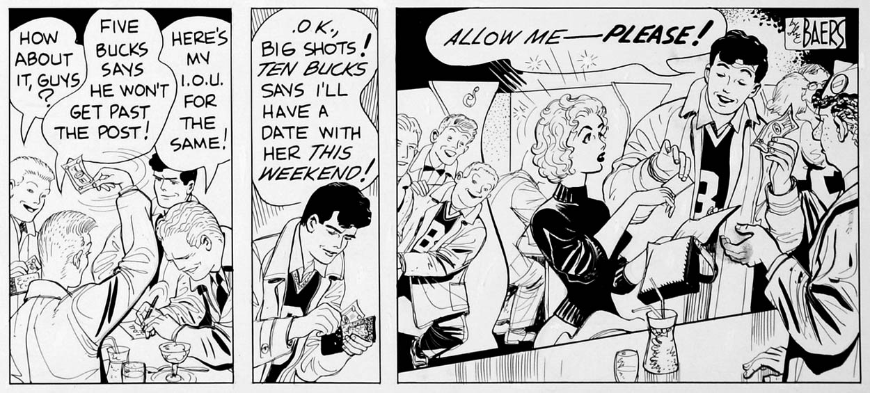 'The Toodles' was originally a gag comic, but eventually became a more dramatic series with serious undertones. Stanley Baer came up with the plots, after which Betsy compiled all these ideas in script form. Her father, Sol Hess, lived long enough to see the comic being launched, but passed away at the end of the same month. By then, the Baers also took over the writing of 'The Nebbs' and its Sunday companion comic 'Simp O'Dill' until the end of those features in April 1955. Afterwards, they included characters from 'The Nebbs' into their own 'Toodles' feature, drawn by Rod Ruth. Becoming experienced scriptwriters, Betsy and Stanley Baers even moved beyond 'The Toodles' and scripted new episodes of 'Mutt & Jeff' (originally created by Bud Fisher) and 'Don Winslow of the Navy' (originally created by Frank V. Martinek and Leon A. Beroth).
