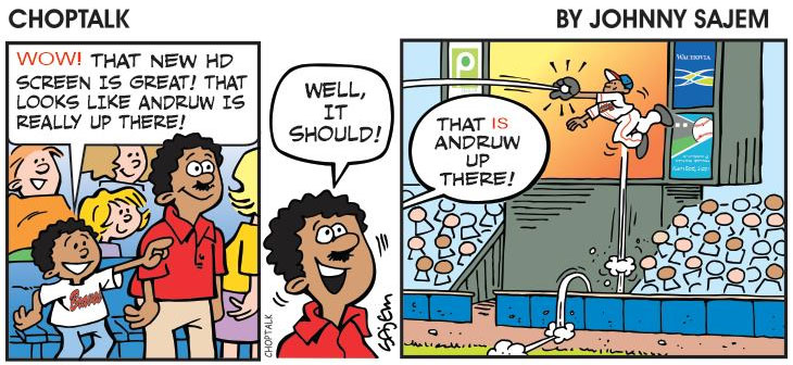In the early 2000s, Sajem also spent seven years providing cartoons and a comic strip to Choptalk, the house magazine of the baseball team the Atlanta Braves. The gag-a-day comic featured jokes that referenced the team's players and recent games, which understandably made them difficult to comprehend for people who weren't supporters, or devoted baseball fans.