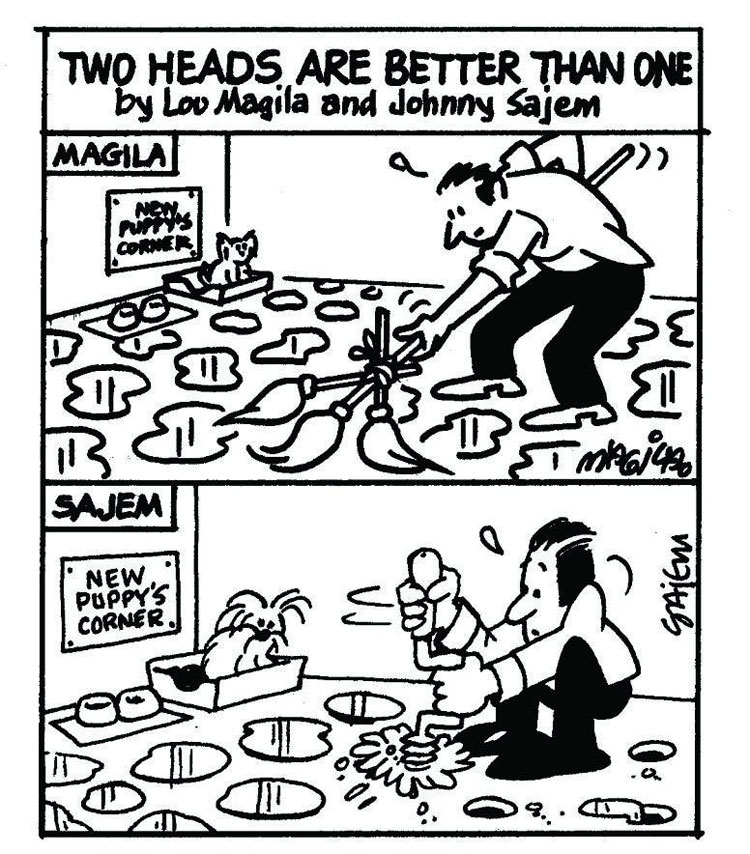 Unpublished comic strip created during the 1980s by Johnny Sajem (bottom panel) and Lou Magila (top panel).