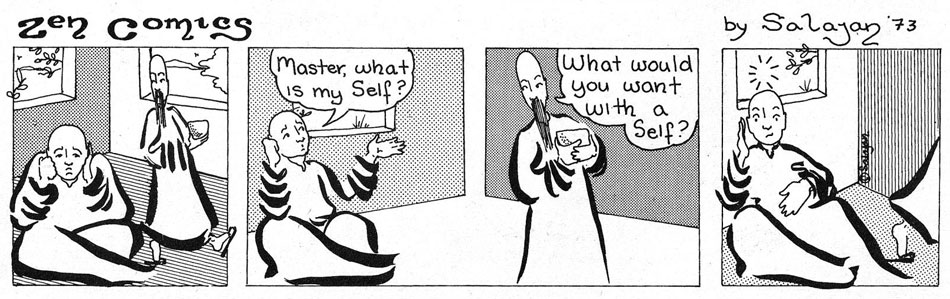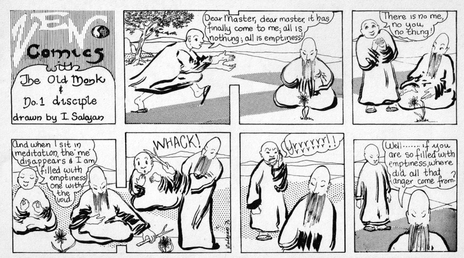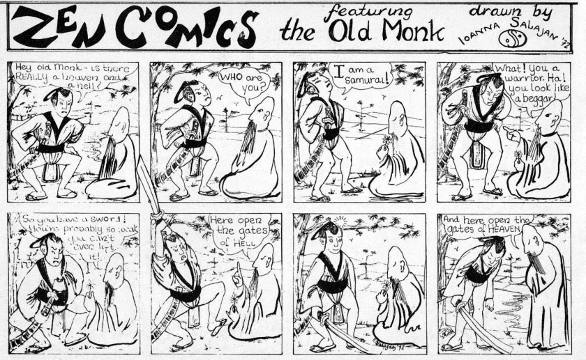 One night, Salajan dreamt of interactions between an old wise monk and his disciple. She recalled waking up at 3 A.M. with the idea: "Hey, Zen would make a great comic!" and immediately went to her drawing table to whip out a gag. This eventually grew into Cosmic Paper's own comic strip, 'Zen Comics'. Each issue featured one or two episodes.