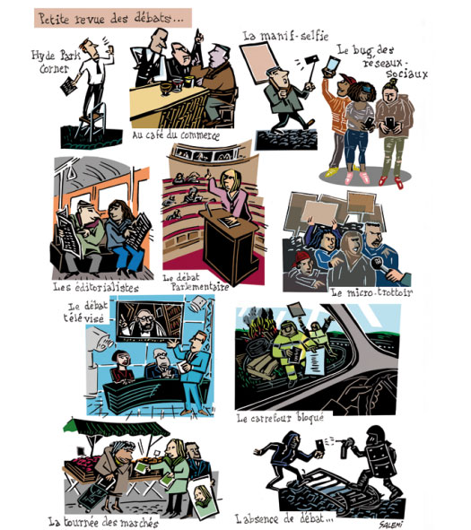 Salemi also draws cartoons inspired by current events. They are published in the magazine Politique (with as subtitle: Revue Belge d'Analyse et de Débat) and their website revuepolitique.be.