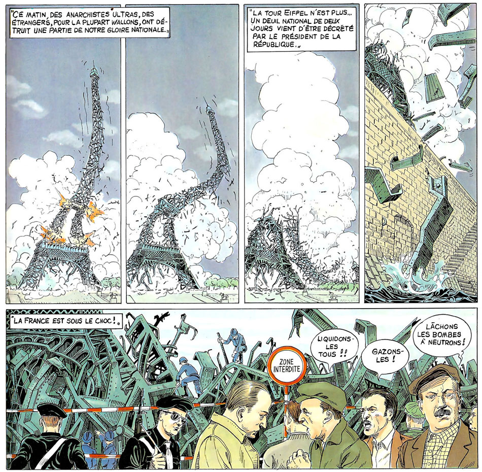 Bucquoy and Santi's first co-creation were two volumes of 'Gérard Craan' (1982), an alternative history set in the 1970s, about NATO establishing a far-right dictatorship. The second volume, 'Au Dolle Mol', was first serialized in Michel Deligne's Félix Magazine. After two books published by Michel Deligne, the authors moved to publisher Ansaldi, where their series was transformed into the three-volume 'Chroniques de Fin de Siècle' (1985-1988). In a dystopian future, the country of Belgium is divided into three autonomous regions, with Wallonia becoming a hippie heaven and Flanders a fascist region. Brussels becomes a NATO-occupied territory, used as a district against communism. Meanwhile, the Belgian anarchist group Autonomes tries to overthrow the far-right dictatorship. The new main character of the series was Gérard Mordant, a former Belgian terrorist who joins the staff of the Belgian Ministry of Foreign Affairs in France. When he has an affair with the daughter of the French ambassador, the French President uses this as a pretext for war.