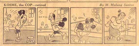 From 1947 on, Malang worked at the Manila Chronicle where their house cartoonist Liborio Gatbonton - who signed his work with "Gat" - became his mentor. Malang not only learned to draw cartoons, but also did advertising, lay-out and photo retouching. His first regular series was 'The Passing Scene', a series of one-panel gag cartoons. His biggest success, however, was the long-running humor comic 'Kosme the Cop' (1947-1965), which would become his signature series. Kosme made his debut in August 1947 and was originally a traffic policeman. By October Malang seemed tired of this concept and had his character retire. From that moment on Kosme spent most of his time at home, being bossed around by his nagging wife. Malang even officially changed the title into 'Kosme the Cop [Retired]' to indicate the change in content.'Kosme the Cop' ran for more than two decades and was notable for being the first locally produced Filipino newspaper comic in a time when most magazines still published American comics. It is also historically significant for being the first Filipino comic strip to be published in the English language.