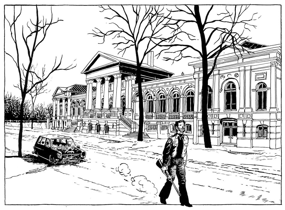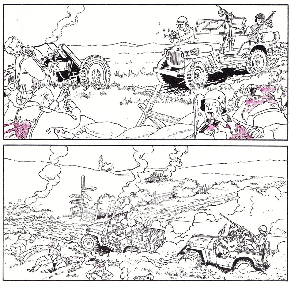 Between 1977 and 1979, Schindeler made about ten contributions to De Vrije Balloen, some written by himself, others from scripts by Patty Klein. Contrary to the more cartoony creations of his college friends, he immediately showed a talent for semi-realistic artwork with detailed and technical backgrounds. Narratively, his stories dealt with scientists, secret agents and space travelers, while playing with the expectations of the readers and cynical twists. A battlefield with dead and wounded soldiers turns out to be a set of toys by a little boy ('Operation: Table-top' in De Vrije Balloen #11), an invention that will change the world forever causes murder and mayhem, but only turns out be a new kind of crisp ('Zo Zout Heeft U Het Nog Nooit...' in De Vrije Balloen #16) and a heroic time jump that allows a space traveler to warn his past self is thwarted by a silly car accident ('Perpetuum Mobile' in De Vrije Balloen #17).